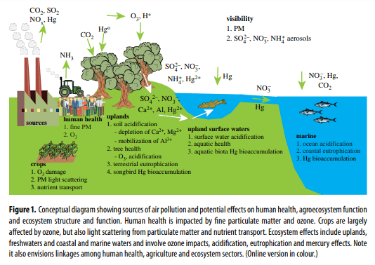 Air pollution contains a variety of chemicals (such as ozone, sulfur, nitrogen, and mercury) that can acidify, eutrophize, and/or exacerbate the hazardous conditions of ecosystems through direct and indirect impacts.